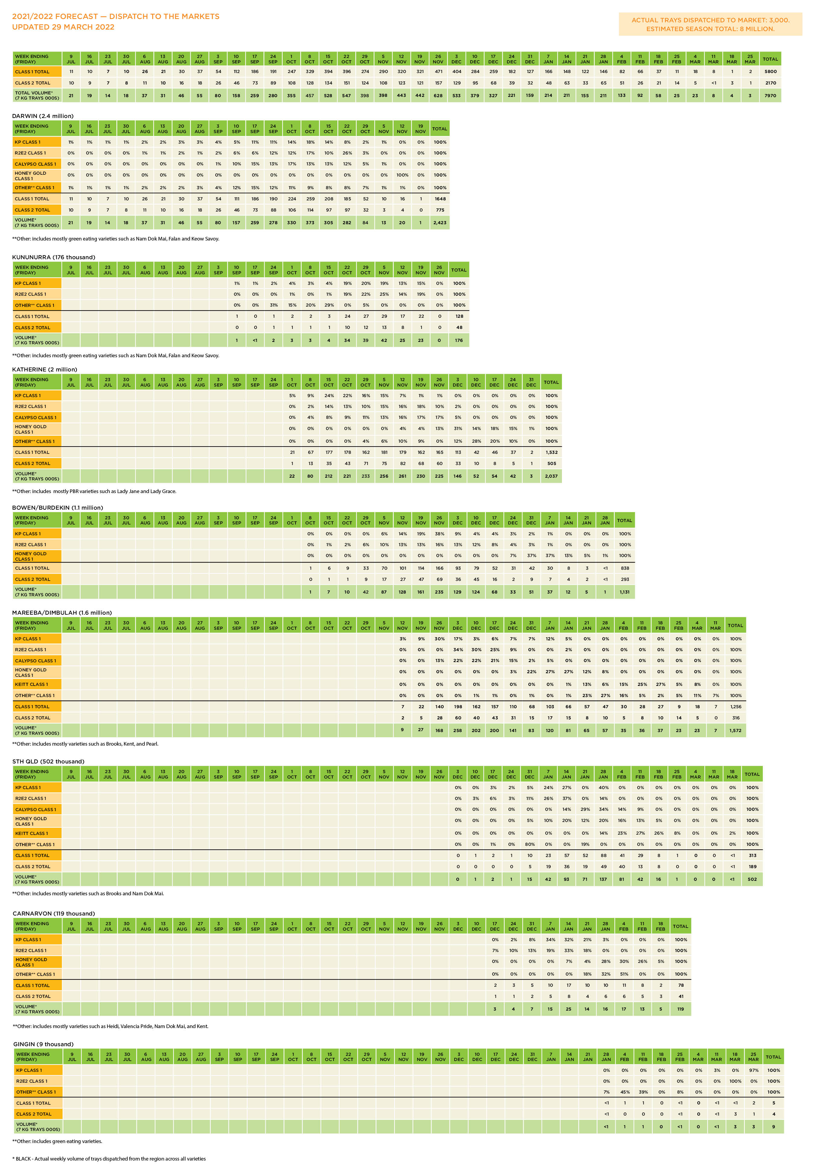 A detailed report including weekly dispatch volumes by region. This report is emailed directly to participating growers and packers.